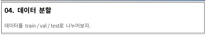 처음에 train, test로 60/40 나눠주고 40%의 test셋에서 다시 test와 val로 나눠주었다.