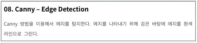 가장 극적으로 엣지를 흰색으로 표현하는 방법은 Canny임을 한 눈에 확인할 수 있다.