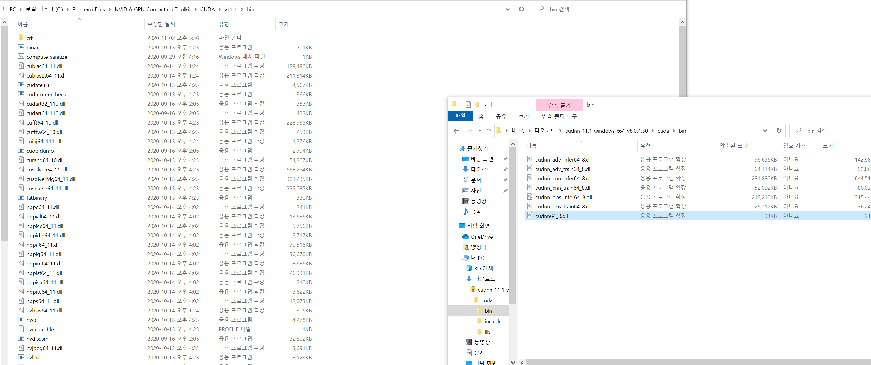 bin 폴더 내에 있는 파일들은 cuda>v11.1>bin 아래에, 이런 식으로 각 폴더 이름이 동일한 11.1 내 폴더에 cuDNN 파일을 복사한다.