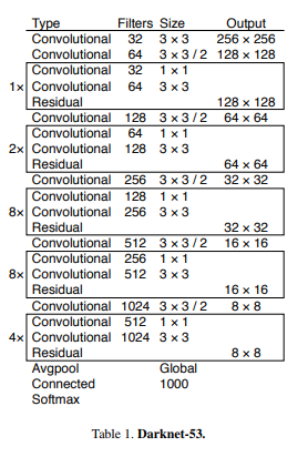 Darknet-53은 ResNet의 skip connection을 도입했으며, Darknet-19, ResNet-101, ResNet-152보다 좋은 성능을 보인다.