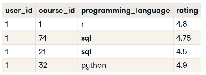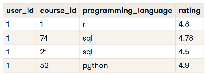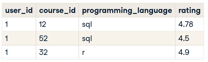 위 테이블에서 사용자가 SQL 강의 두 개와 R 강의 한 개를 평가하였다.