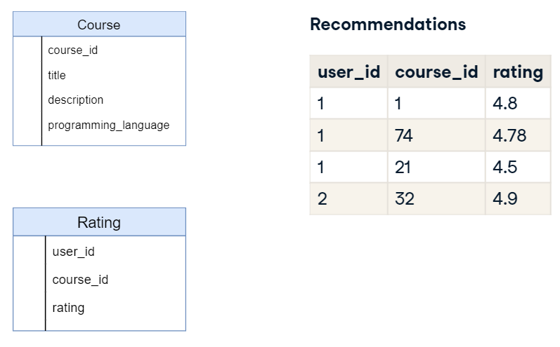 위 테이블처럼 user_id와 course_id 데이터 조합이 rating 테이블에 존재하지 않는 경우를 추천하는 것이다.
