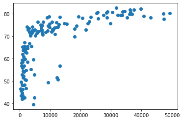 scatter(x축, y축)을 해보면 산점도 그래프를 그릴 수 있다.