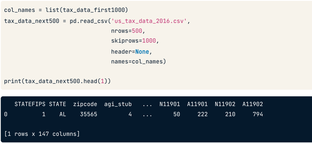 위 코드를 해석해보면, 'us_tax_data_2016.csv'파일을 읽는다. 1000개의 행을 건너뛰고 다음 500개의 행을 읽는다. header가 포함되지 않기 때문에 header 인수를 None으로 설정한다.