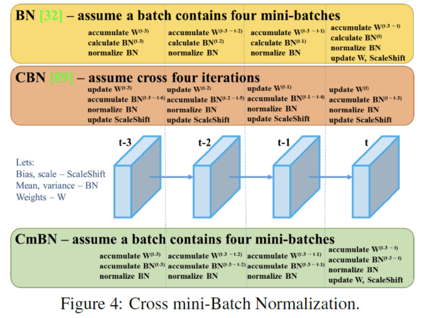 - Cross mini-Batch Normalization : CBN의 변경된 version으로, 단일 batch에서 mini-batches 사이에 대한 통계를 수집한다.