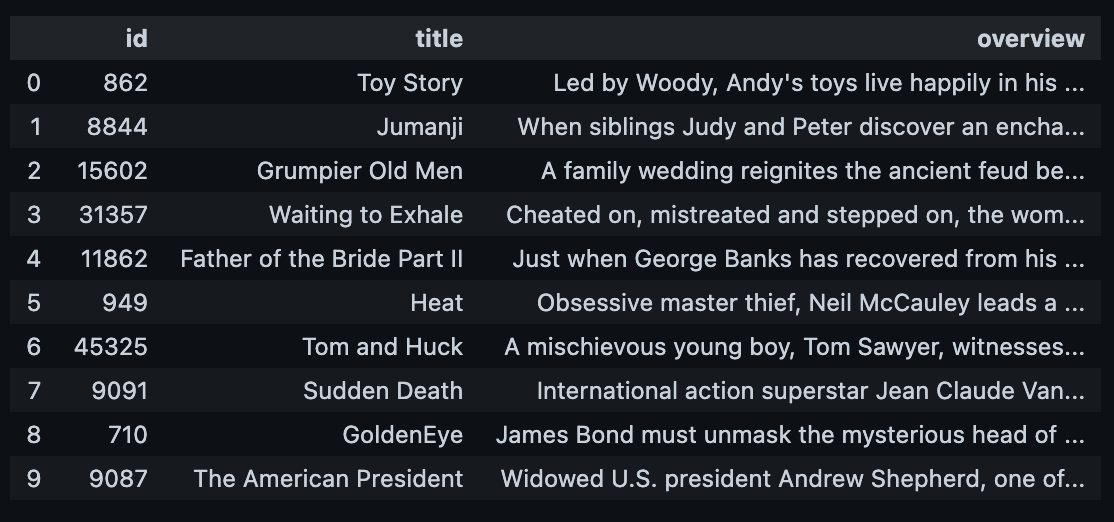 영화 id, 제목, 줄거리 정보가 있는 데이터셋이다.