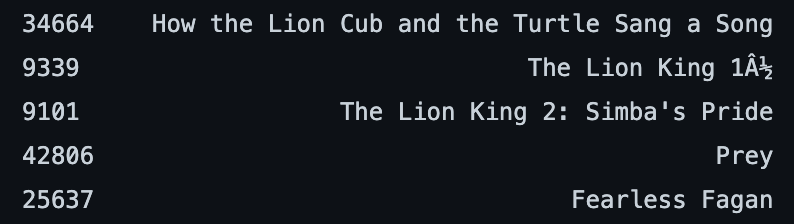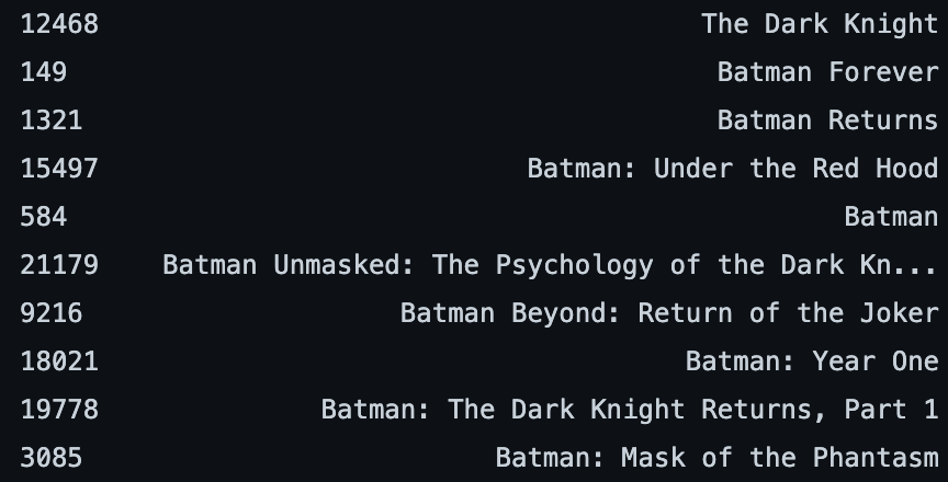 마지막으로 내가 입력한 영화제목과 유사도가 높은 N개의 영화제목을 반환해주는 함수를 통해 추천 시스템 코드 작성을 마무리한다.
