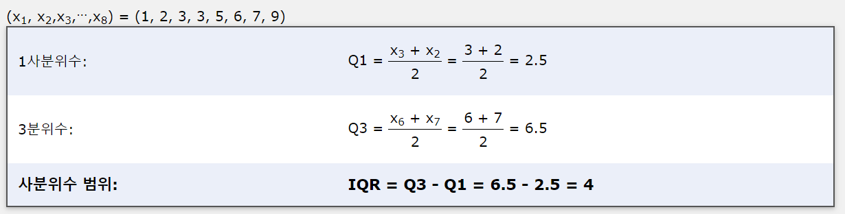 - 사분위범위(IQR) : 25번째 백분위수와 75번째 백분위수 차이를 통해 변위측정한다.