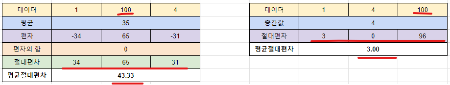 - 수식이 복잡해도 수학적으로 제곱한 값이 절댓값보다 통계 모델 다루기 편리하다는 이론을 근거로 평균절대편차보다 표준편차를 더 선호한다.
