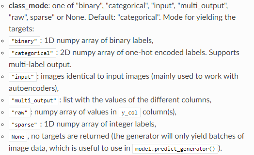 (D)는 class_mode이다. class_mode로는 categorical(default), binary(sparse), raw(multi_output), input(None)가 있다.