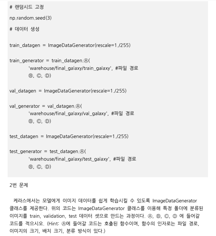 (B)는 target size가 될 것이다. 딥러닝으로 은하 분류하기 문제에서 사용하는 데이터는 50x50 크기의 이미지이기 때문에 target_size=(50,50)이 되면 된다.