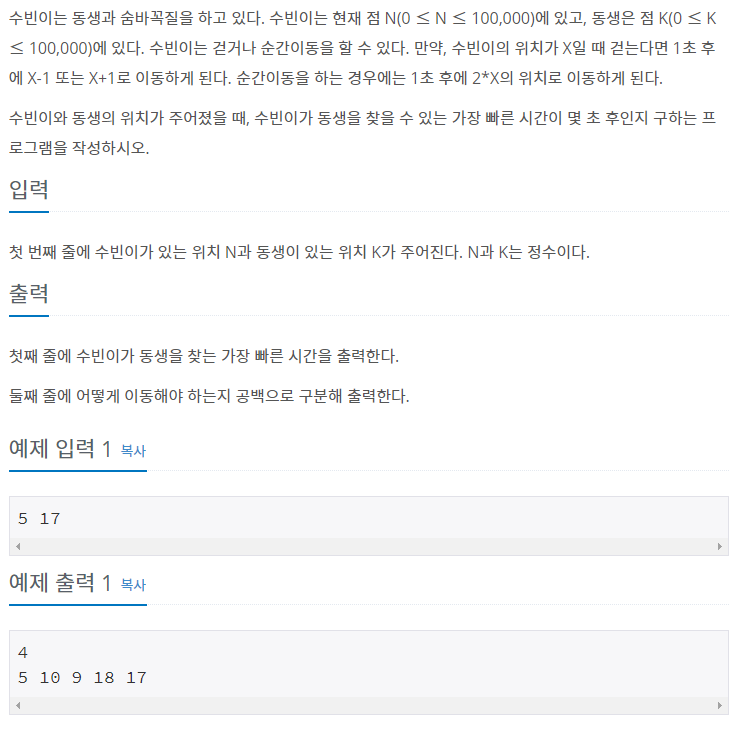 이전 숨바꼭질 문제와 다른 점은 어떻게 이동해야하는지 이동경로를 공백으로 구분해서 출력해야한다. path배열에 next step번째에다가 현재 step을 저장해두고 나중에 역추적해서 출력해주면 된다. from collections import deque N, K = map(int, input().split()) q = deque() q.append(N) time = [0 for _ in range(100001)] path = [0 for _ in range(100001)] ans = [] while q: v = q.popleft() if v == K: print(time[v]) ans.append(str(K)) while v!= N: ans.append(str(path[v])) v = path[v] an..