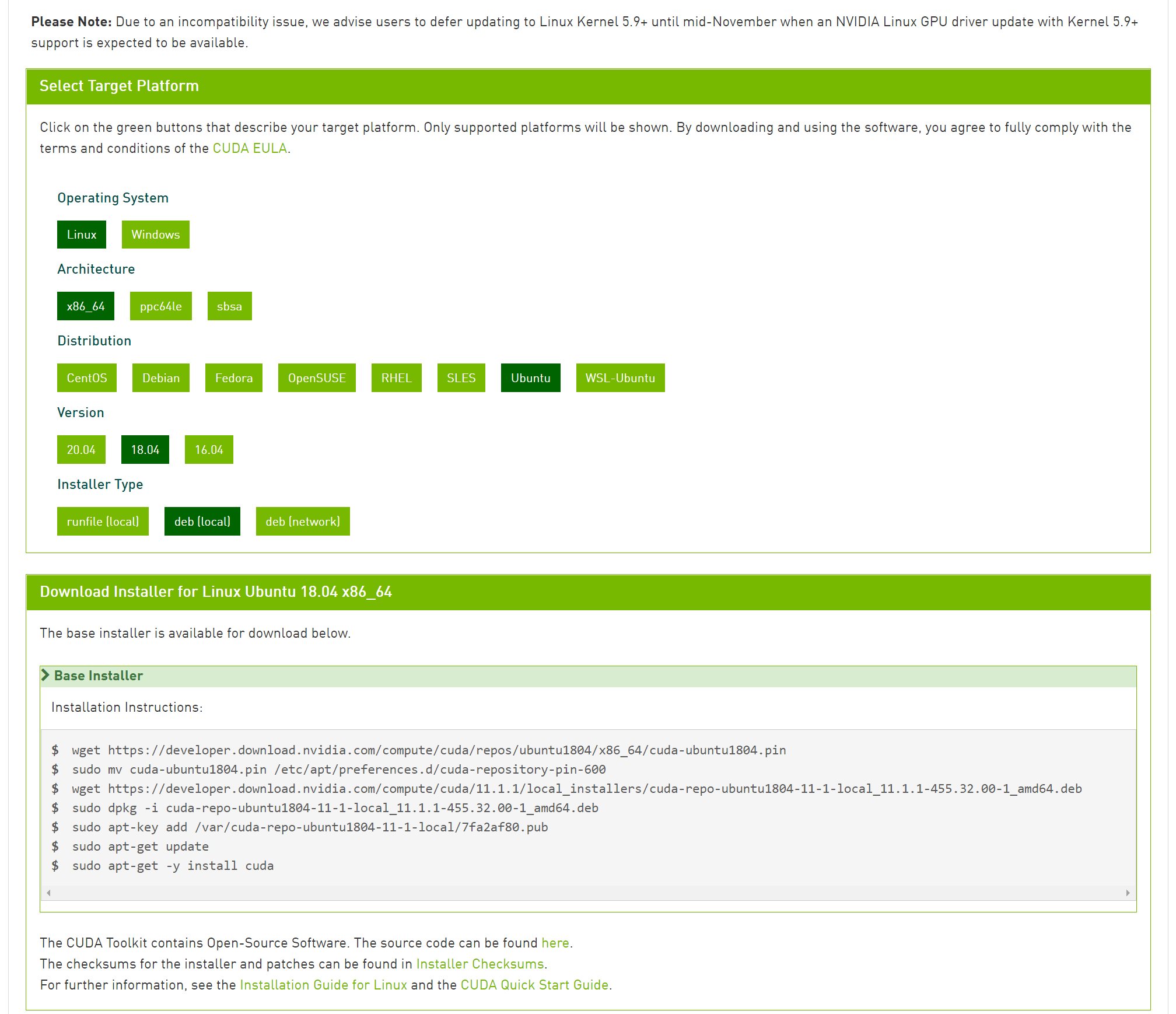 1. CUDA Toolkit을 다운로드한다. (아래 링크) CUDA Toolkit 11.1 Update 1 Downloads Please Note: Due to an incompatibility issue, we advise users to defer updating to Linux Kernel 5.9+ until mid-November when an NVIDIA Linux GPU driver update with Kernel 5.9+ support is expected to be available. Select Target Platform Click on the green b developer.nvidia.com 본인 우분투 버전에 맞는 선택 후 아래 가이드 그대로 따라하기 우분투는 위 사진처럼 안내하..